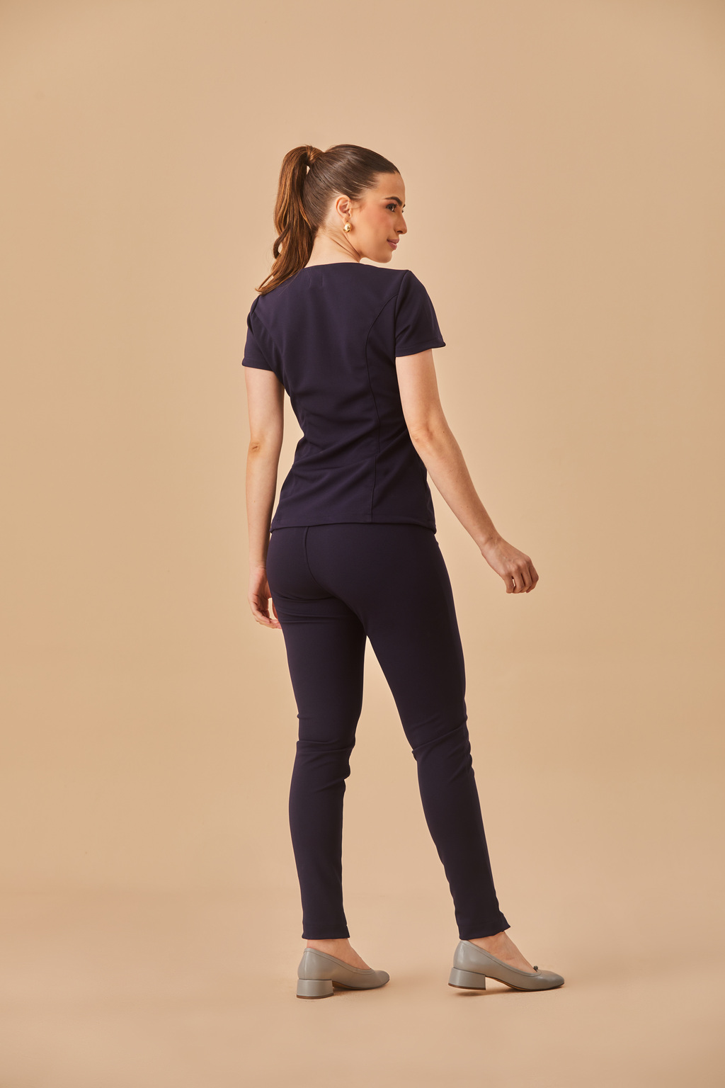 Blusa com gola delicada, detalhe de costura que modela a silhueta. Dois bolsos frontais. Calça com pala alta, que proporciona mais conforto ao dia a dia, ziper na perna que dá elegância e modernidade.